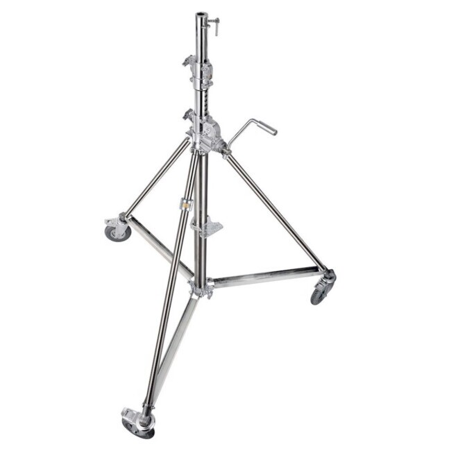 O suporte Avenger Super Wind-up 40 de 12,6' com rodas com freio é um suporte resistente, cromado e de aço inoxidável que sobe até uma altura máxima de 12,6' pés. Ele possui uma manivela dobrável (wind-up) e uma perna de nivelamento para terrenos irregulares.